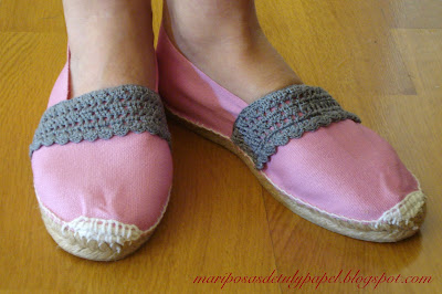 El año pasado hice unas alpargatas bordadas y otras con ganchillo que eran para fiestas, en blanco y rojo. Así que ahora, para éste veranito he hecho unas en otro color. A ver si te gustan!!